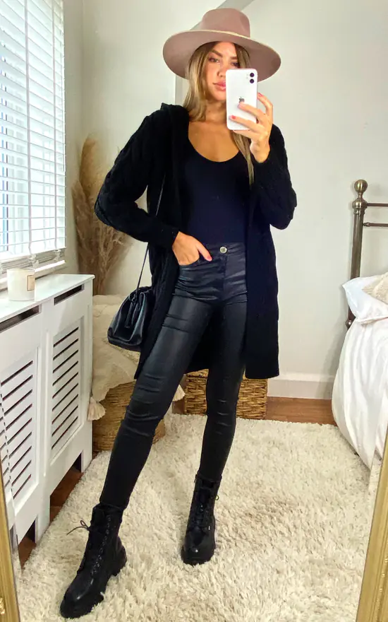 The Hooded Cable Knitted Longline Cardigan In Black features long sleeves, an open front and a chunky cable knit design.