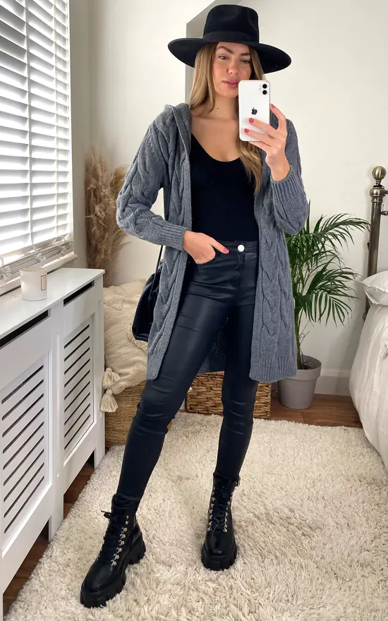 The Hooded Cable Knitted Longline Cardigan In Charcoal features long sleeves, an open front and a chunky cable knit design.