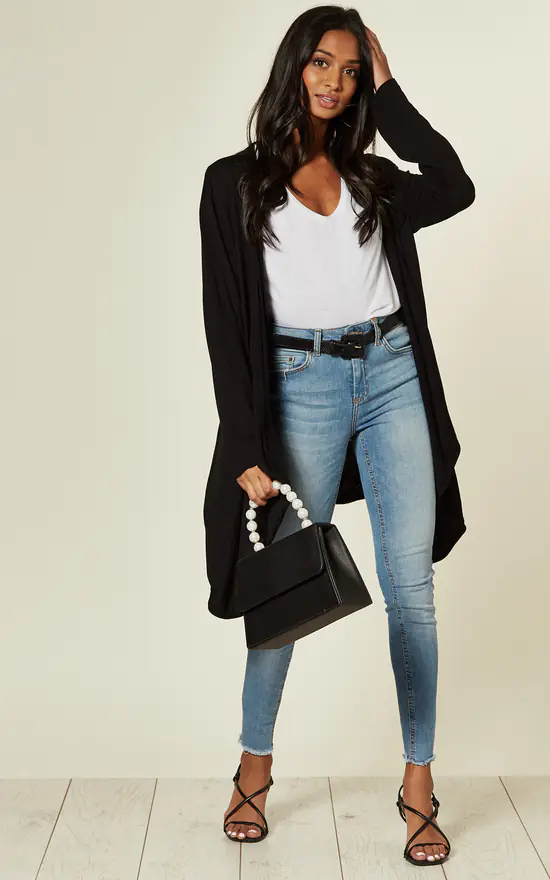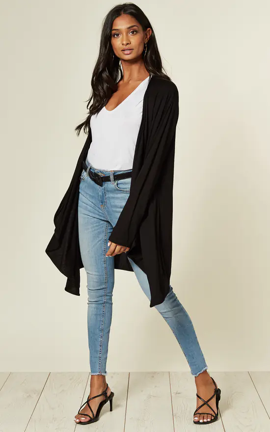 The Jersey Waterfall Cardigan In Black is a flowing jersey cardigan that features a wraparound collar, open front without buttons and long sleeves.