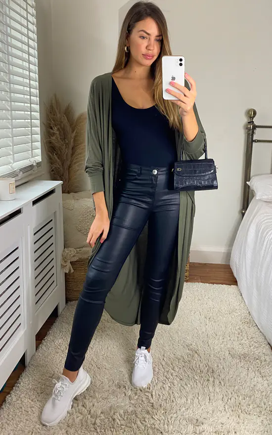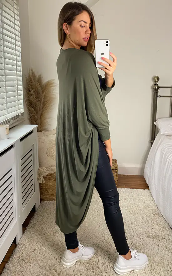 Aftershock London The Kimono Cardigan In Khaki is a longline cardigan that features a kimono design with long batwing sleeves and no buttons.