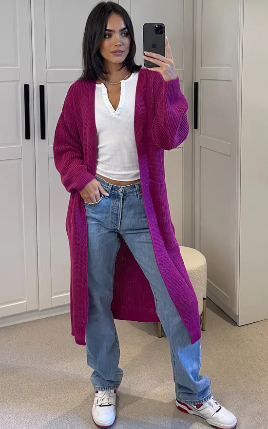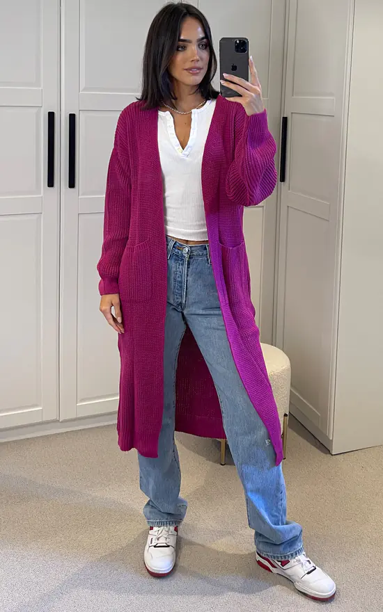 The Aftershock London Knitted Longline Cardigan with Pockets in Purple features a soft knit design with an open front with no buttons, dropped shoulders, long sleeves and front pockets.