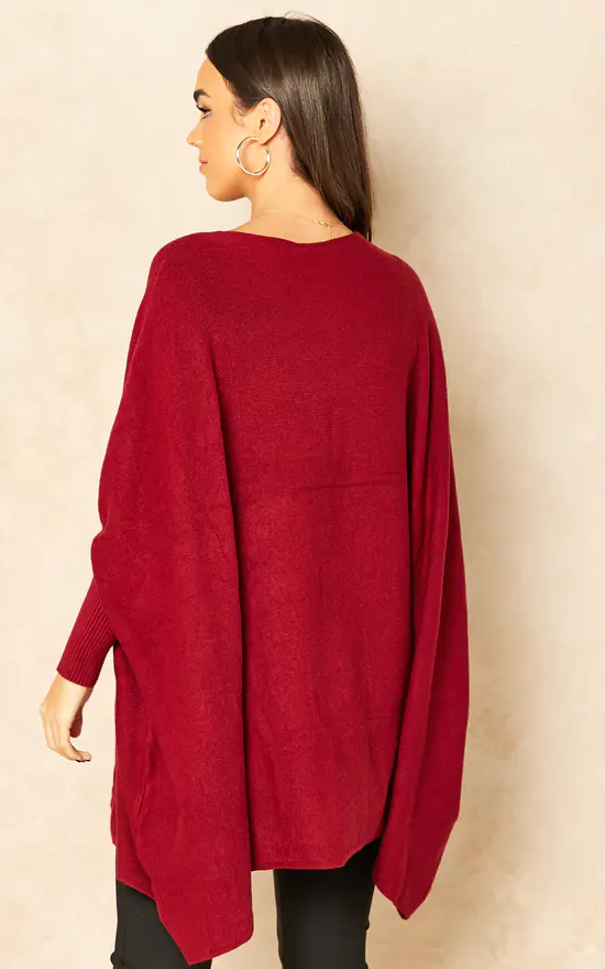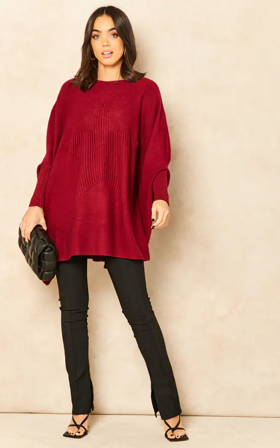 Knitted Poncho Jumper with Star Design in Wine features a boat neckline, ribbed long sleeves and a flowing design with a star detail.