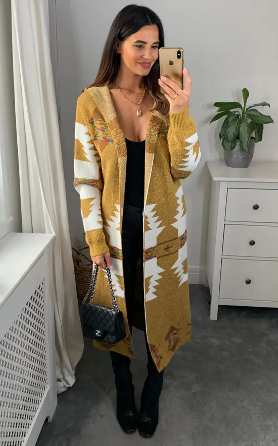 Adorned with a bold Aztec intarsia design, this long line cardigan is cosy and stylish at the same time. We love the hood and the jewel colours, wear with jeans and a simple tee at the weekend.