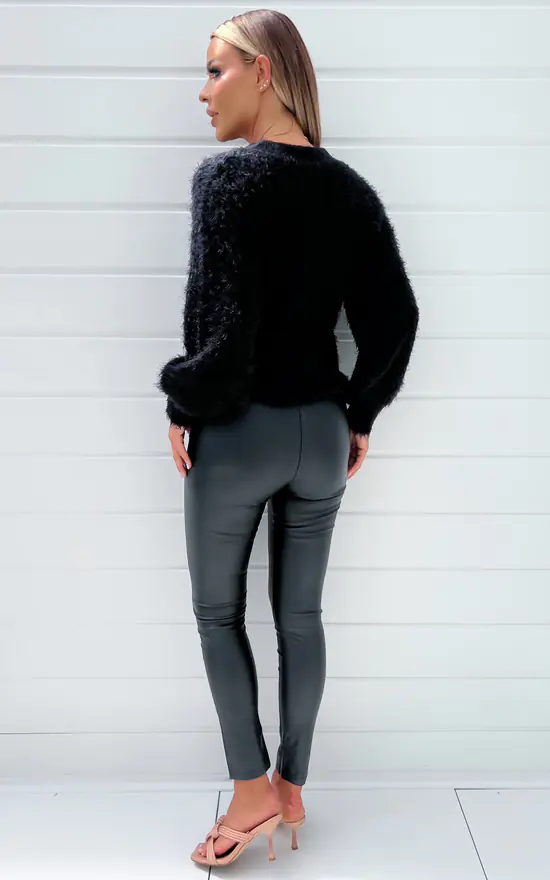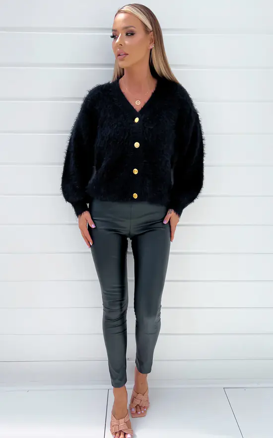 Stay cute this season in our Black Fluffy Kit Balloon Sleeve Gold Button Front Cropped Cardigan! Super versatile and easy to style with every outfit. Featuring four gold buttons, long balloon sleeves and a cropped shape.