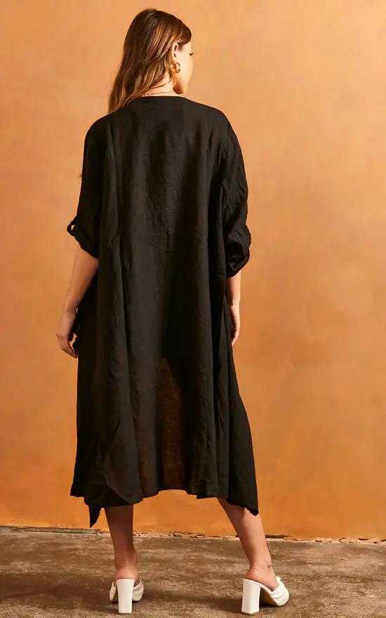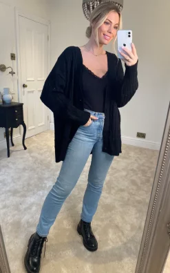 This open front waterfall cardigan is a great addition to your spring/summer wardrobe. Featuring rolled sleeves, floaty split hem this cardigan looks great when worn over a casual daytime outfit!