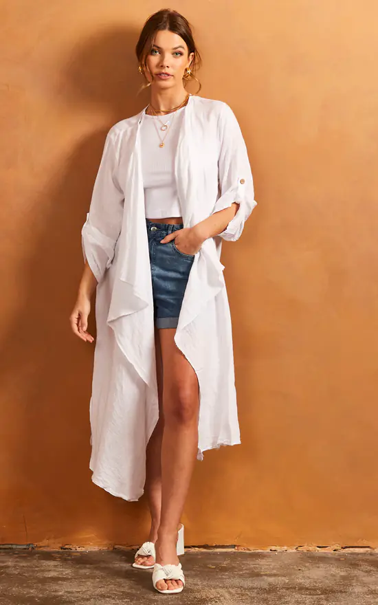 This open front waterfall cardigan is a great addition to your spring/summer wardrobe. Featuring rolled sleeves, floaty split hem this cardigan looks great when worn over a casual daytime outfit!