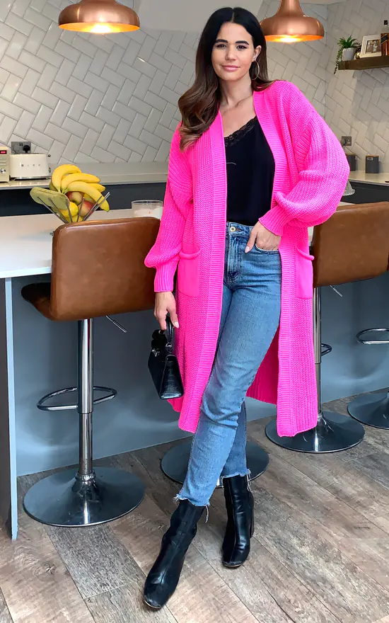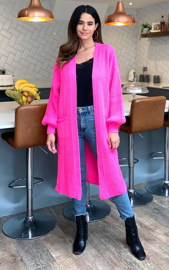 Exclusively by Blue Vanilla. Our Longline Double Pocket Knitted Cardigan In Neon Pink is a staple to have in your wardrobe! Chuck on over any outfit on a summers evening to stay comfy and warm!