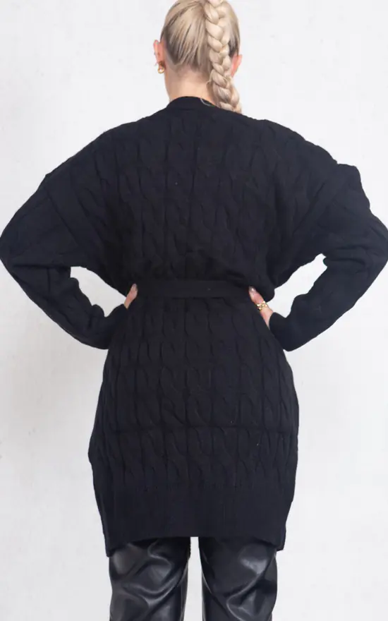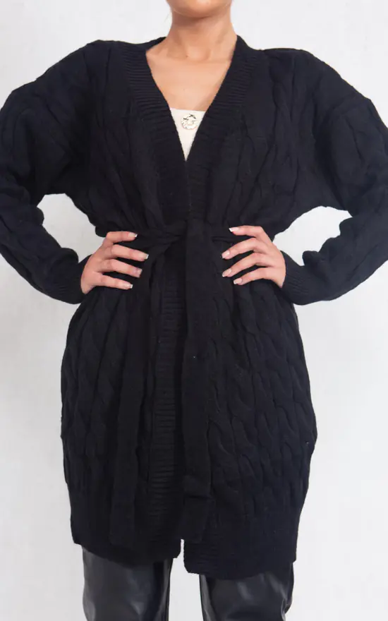 Our Black Cable Knit Belted Cardigan is part of our latest Knitwear & Cardigans collection. A thick cable knit material with a tie waist belt, long sleeves and ribbed detailing.