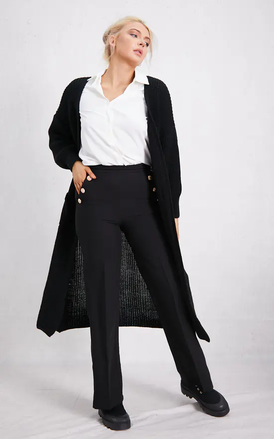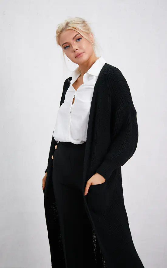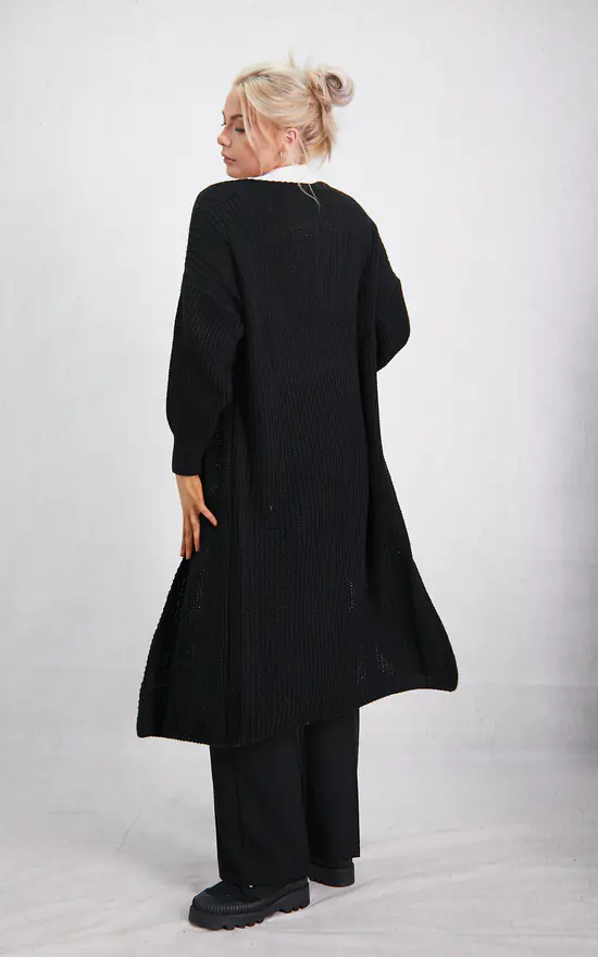 Our Black Oversized Cable Cozy Open Cardigan is part of our latest Knitwear & Cardigans collection. A thick cable knit material with a soft touch, long sleeves, and ribbed detailing.
