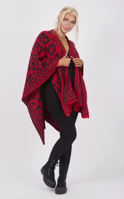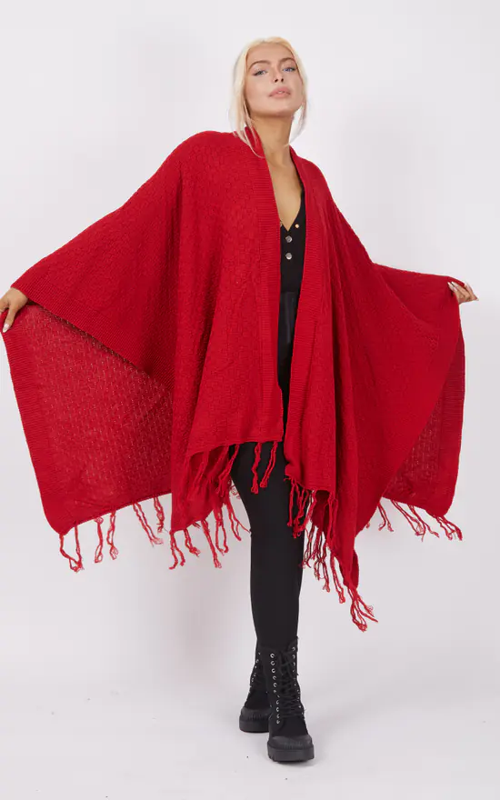 Our Red Knitwear Tassels Poncho is from our latest Poncho collection and will keep you warm and looking stylish during winter nights. Featuring a knitted poncho with wide long length arms and finished with eye-catching frayed trims and tassels.