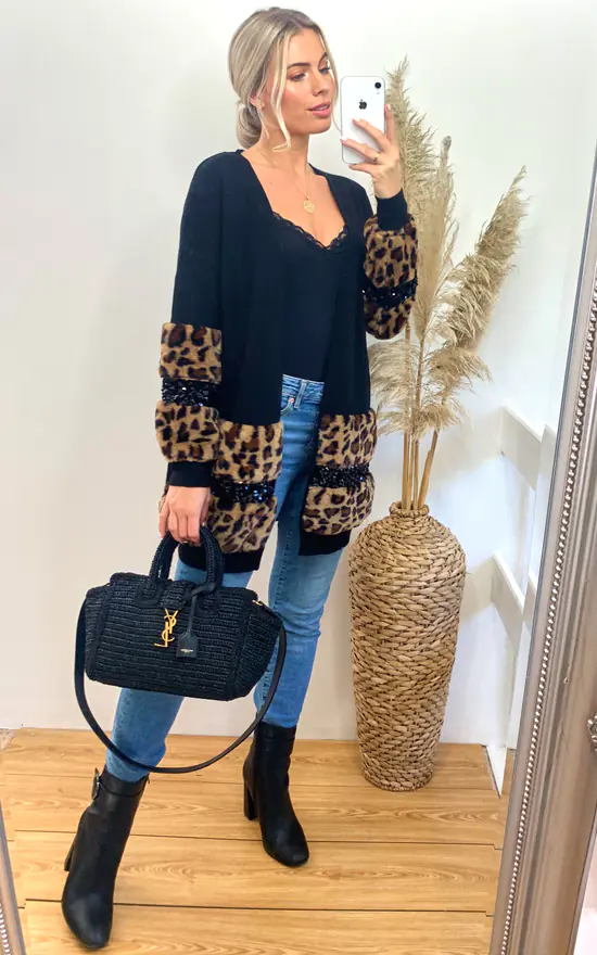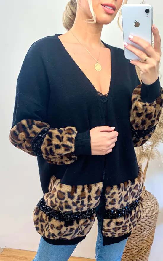 – Faux leopard fur embellished cardigan