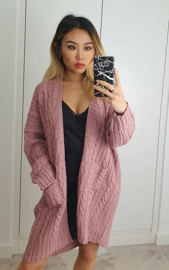 Stunning warm chunky knit longline cardigan with pockets on either side in Pink