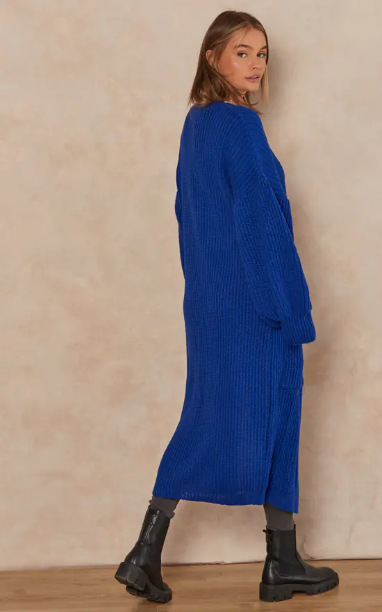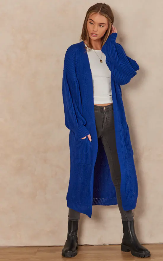This slouchy cardigan will provide a relaxed vibe to any wardrobe. With a blue long, chunky knit, long sleeves, and a baggy fit, pair it with light wash denim for a look that can be dressed up or down.