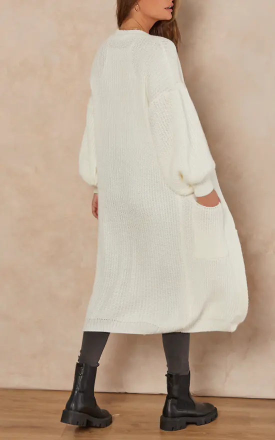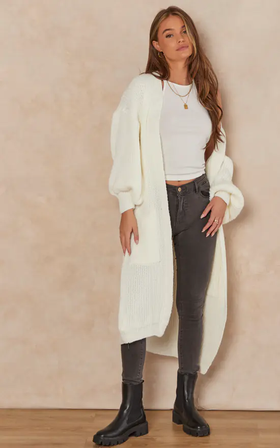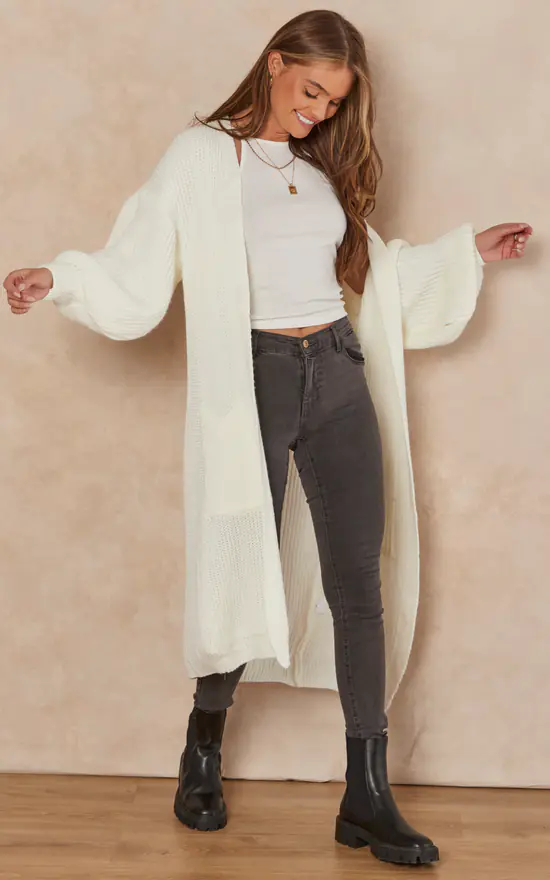 This slouchy cardigan will provide a relaxed vibe to any wardrobe. With a white long, chunky knit, long sleeves, and a baggy fit, pair it with light wash denim for a look that can be dressed up or down.