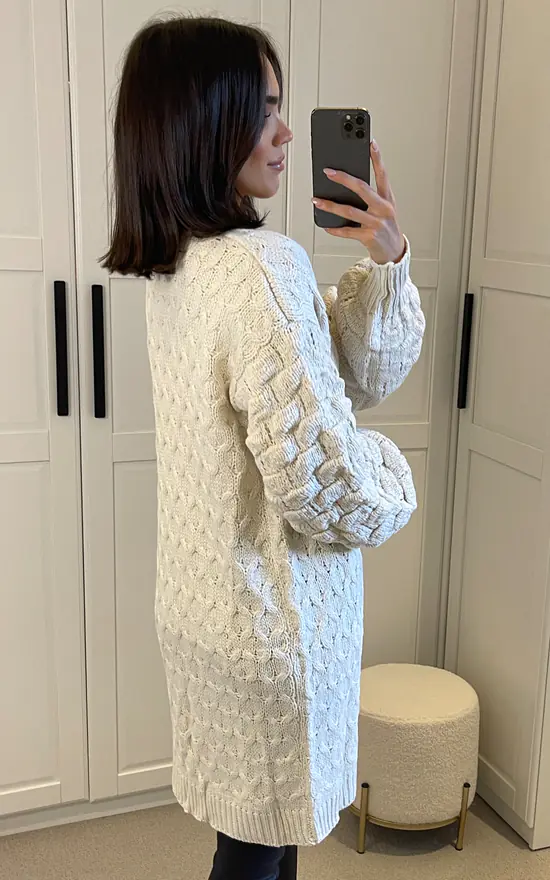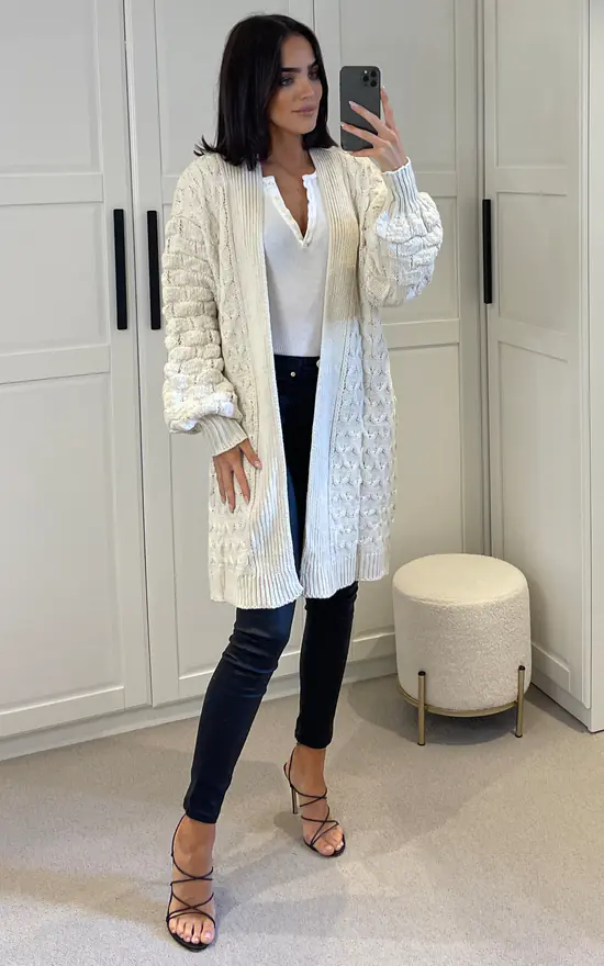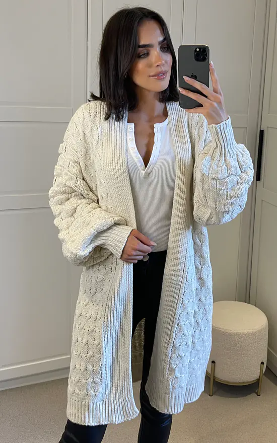 Cream Longline Knitted Cardigans Looking for layers, this cardigan is cute and cosy. Featuring long sleeves this luxe knit is the perfect way to layer your look this Autumn season. This cardigan looks great teamed with a classic tee, jeans and trainers for a fresh on-trend daytime look.