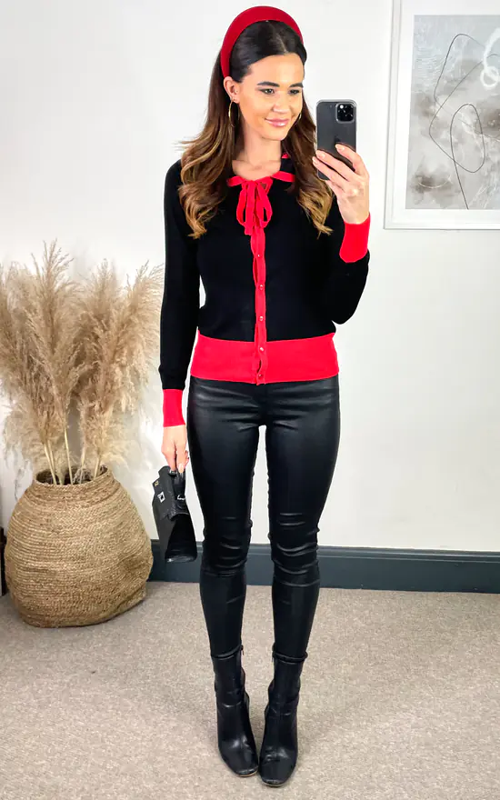 We are bringing to you our AW20 collection of cardigans, ready to dress up with our lavish choices of dresses. The design features an embellished rose on the collar of the cardigan, then leading to a bow tie neckline giving it the finishing touches to this design. The fabric has a lovely soft feel, complementing the love for all our knitwear collections. Also available in black/black and black/grey.