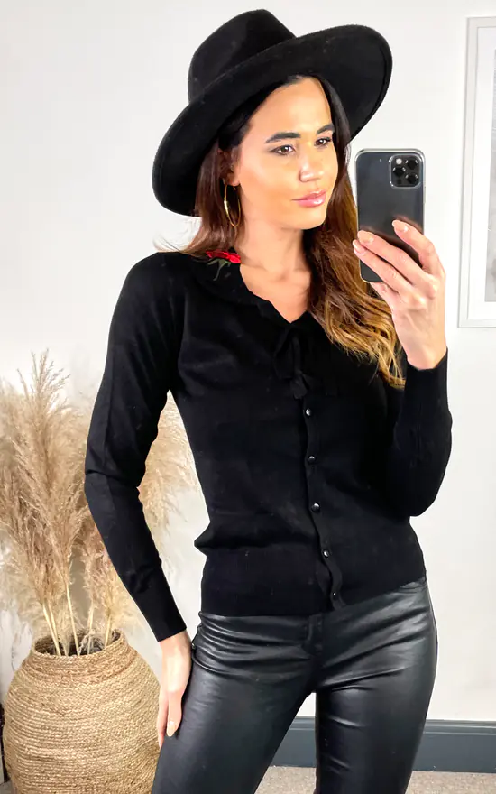 We are bringing to you our AW20 collection of cardigans, ready to dress up with our lavish choices of dresses. The design features an embellished rose on the collar of the cardigan, then leading to a bow tie neckline giving it the finishing touches to this design. The fabric has a lovely soft feel, complementing the love for all our knitwear collections. Also available in black/red and black/grey.