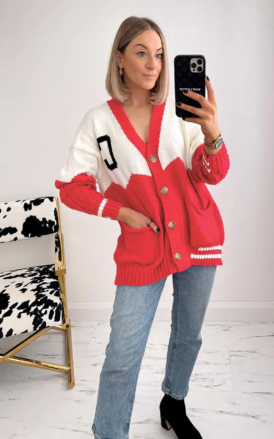The Jordyn Button Down Cardigan with Letter Detail is the perfect addition to your everyday wardrobe. With a stylish button down detail, abstract panelling and cool letter detail, this cardigan adds an edgy touch to any outfit.