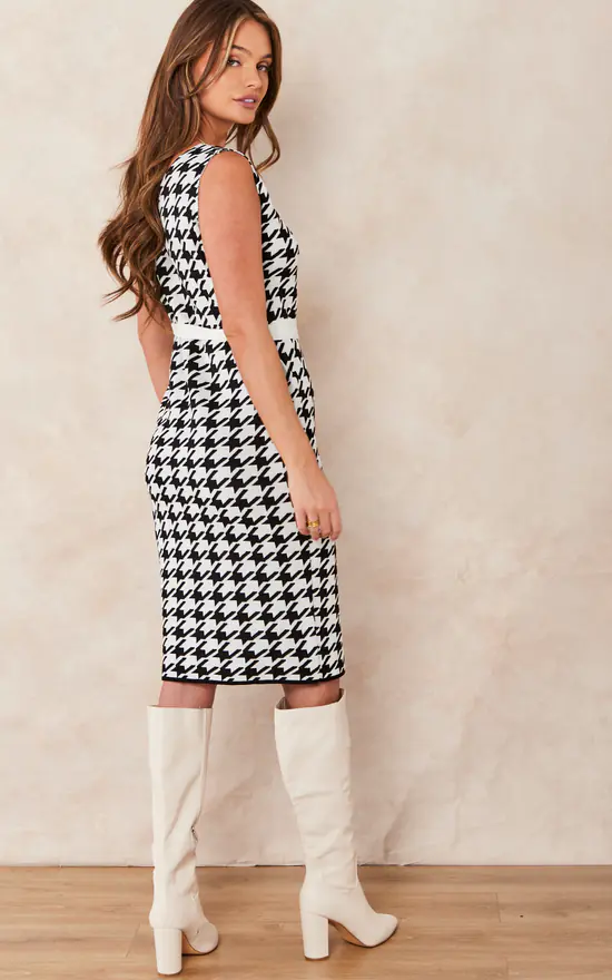 2 in 1 Midi dress and Cardigan in Black/White Goose foot print. V Neck Sleeveless Midi dress with wrap belt of the waist combined with Longline Cardigan with 2 pockets and buttons. Both items can be worn separately, which gives you opportunity to create many different outfits in Autumn-Winter season.