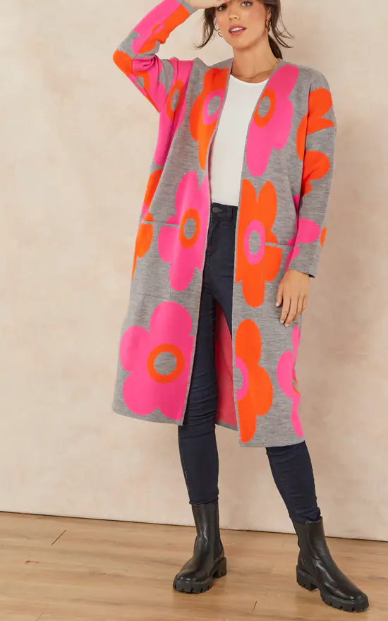 Longline Midi Cardigan with 2 pockets in Fuchsia Pink / Orange Floral print. Stylish Cardigan/Coat for you autumn-winter outfits.