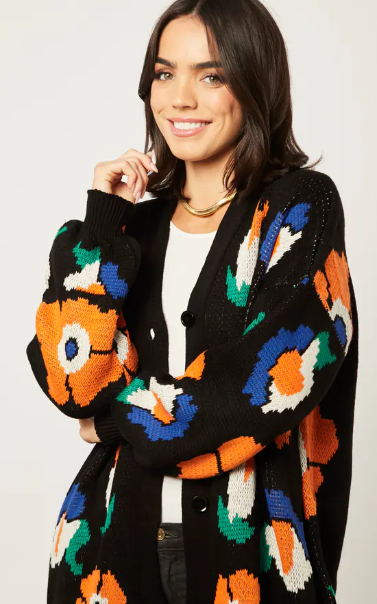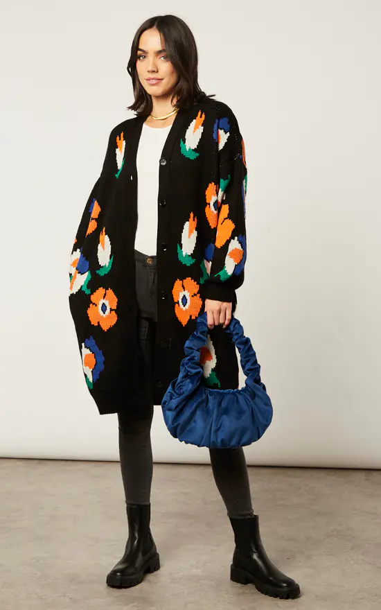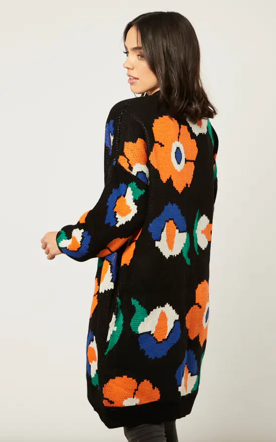 Longline Floral print Oversize Cardigan / Coat with buttons and pockets. Black Knitted Cardigan with Multicolour floral print.