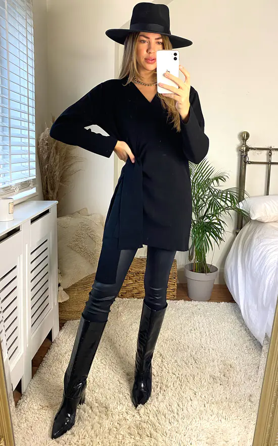 This beautiful knitted wrap cardigan in black is a longer length and also has long sleeves to help keep you cosy this season, with the side wrap giving the style an added feminine detail. It has a relaxed, oversized fitting – perfect for styling with leather-look trousers like our model, Cara.