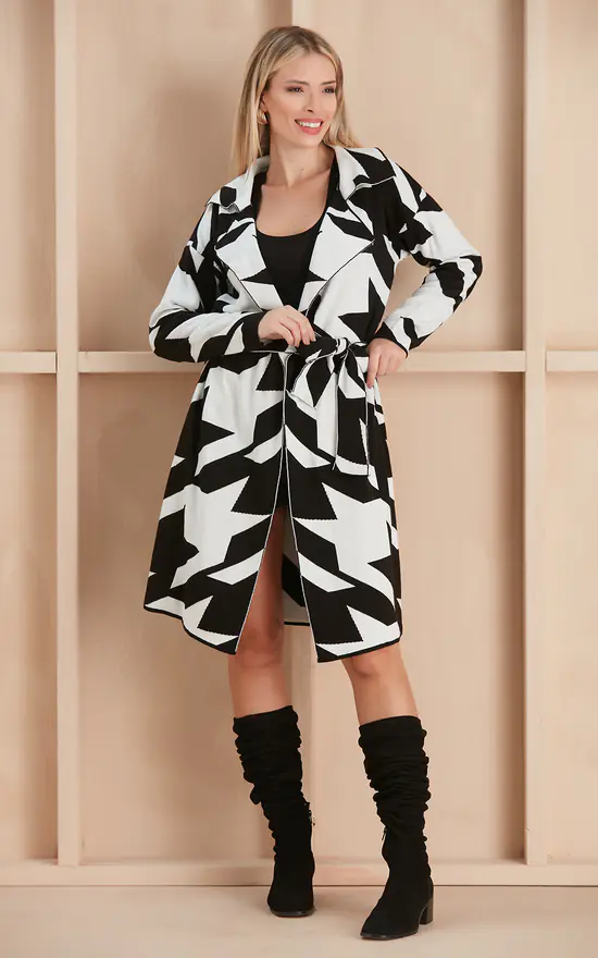Longline Cardigan/Coat in Black/White Goose Foot print with best.