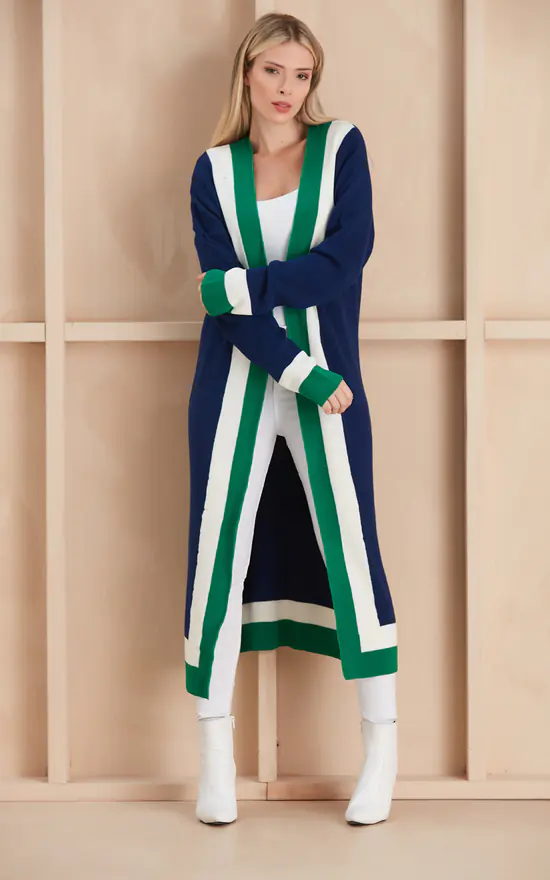Stylish Longline Knitted Cardigan in Striped Print in Colour block. Long Sleeve Navy Midi Cardigan decorated with White and Green Stripes. Stylish accent in your Autumn-Winter Outfit.