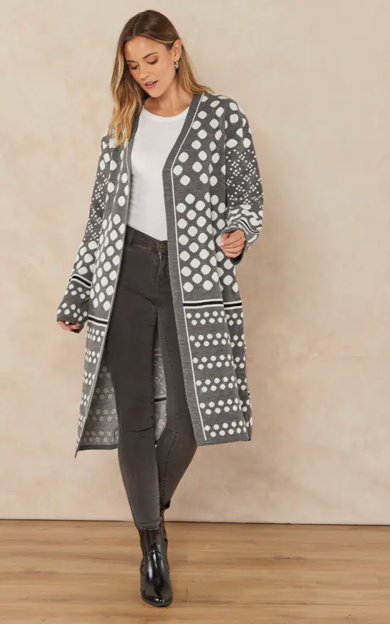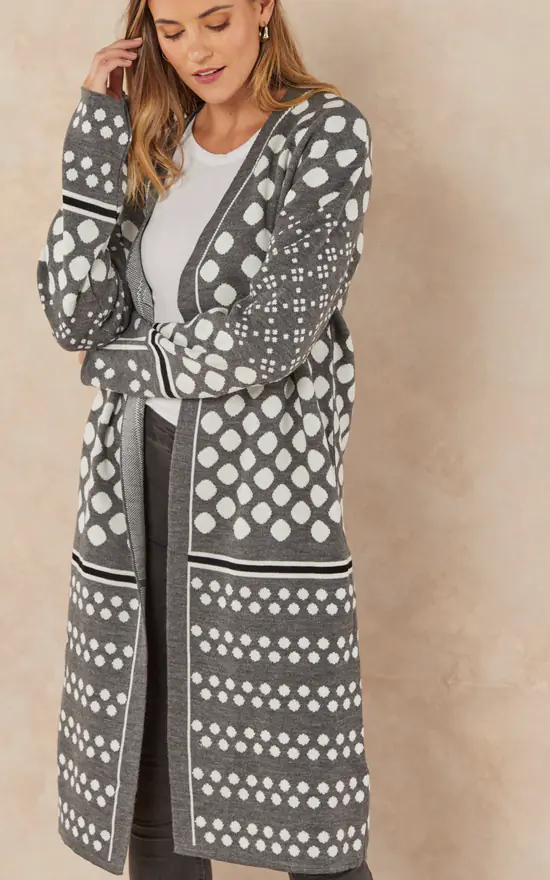 Longline Knitted Cardigan in Grey and White multi print: Polka dot and stripes. Stylish and comfy designs for everyday Autumn-Winter casual look.