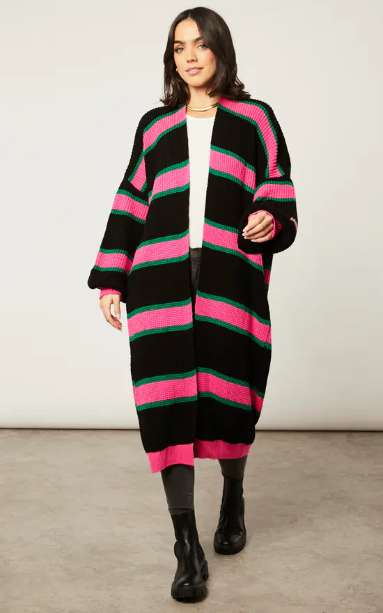 Chunky Knitted Striped Longline cardigan. Oversize Knitted Cardigan in Pink/Black stripes with green detailing.