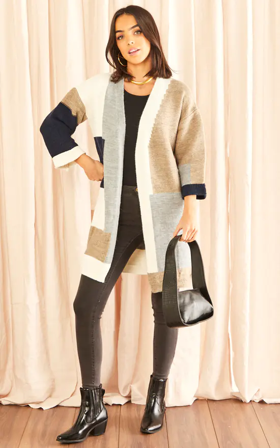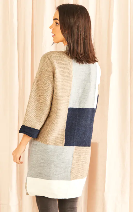 Long Sleeve Knitted Cardigan in Navy/Grey colour block. Longline cardigan is super warm and stylish.