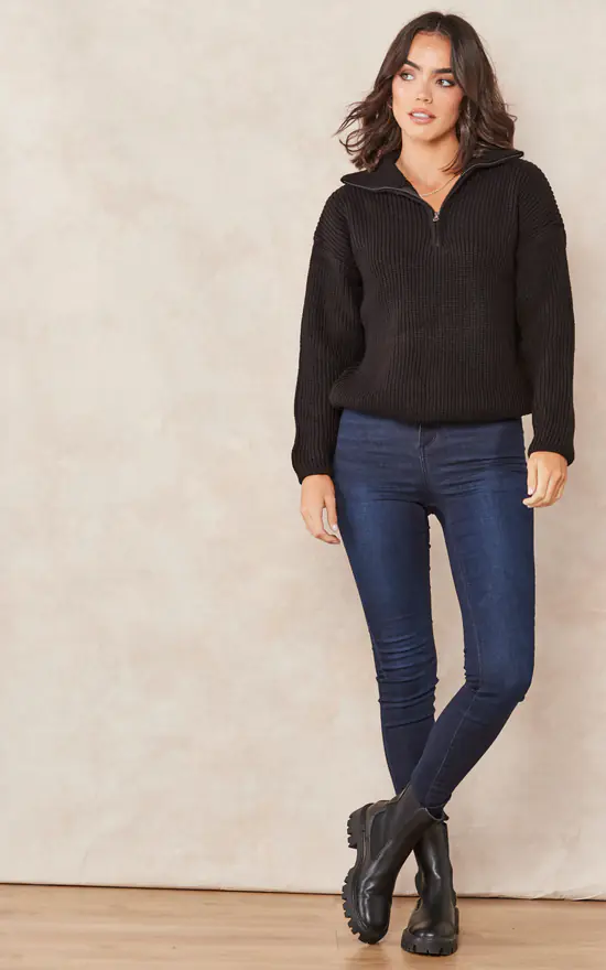 High Neck Black Knitted Jumper with zip. This Polo neck is a classic casual sweater for your autumn-winter wardrobe.