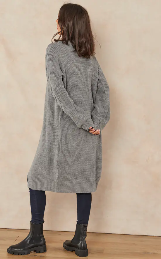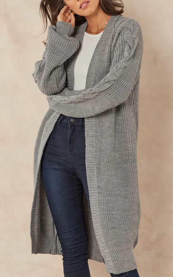 Longline Cardigan in Grey colour with Twisted details on the sleeves. Long Sleeve Oversize Midi Cardigan can be easily styles with any top and jeans/leggings. Cozy knitted cardigan for your wardrobe.