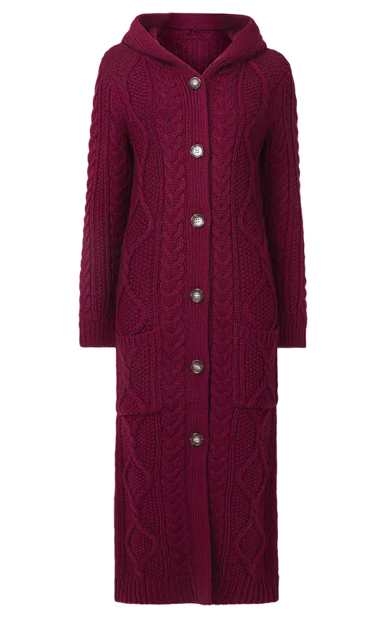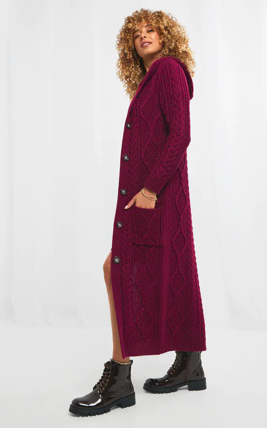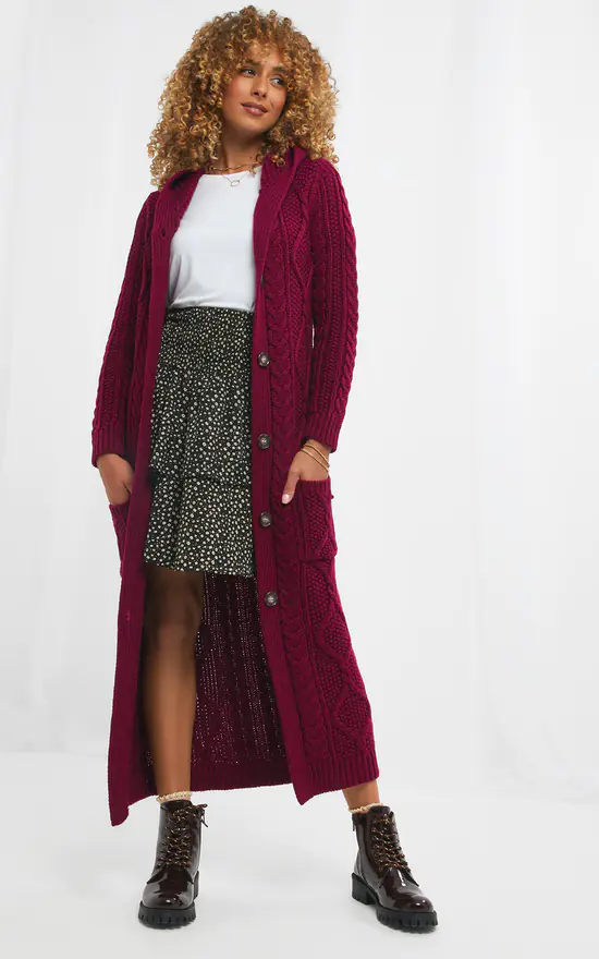 Our classic hooded cable knit cardigan is a real staple for your winter wardrobe. Whether you’re on a walk or going out to lunch, it’s bound to brighten your day. You’ll have fun styling this longline piece too – fasten the buttons for a cosy vibe, or leave it open to look cool and confident showing off your outfit underneath.