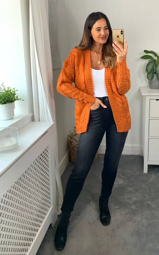 Whether you’re walking the dog or getting cosy on the sofa, this long-sleeved slouchy cardigan is great for keeping out the chill. The perfect laid-back layering piece, it combines a classic cable knit style with an open design, so you can still show off your favourite top underneath. Just choose black or burnt orange, then have fun styling it your way.
