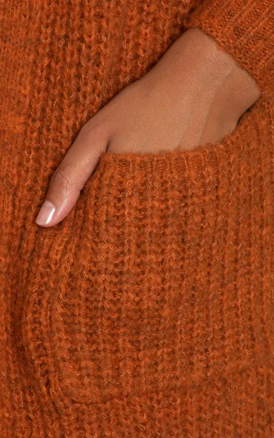 Our longline cardigan will become one of your trusted go to layering pieces of the season, cosy, stylish, and did we say that we love the flattering orange hue. Relaxed fitting and crafted in a soft knit with long sleeves, open front and we have added front patch pockets. Back length 90cms.
