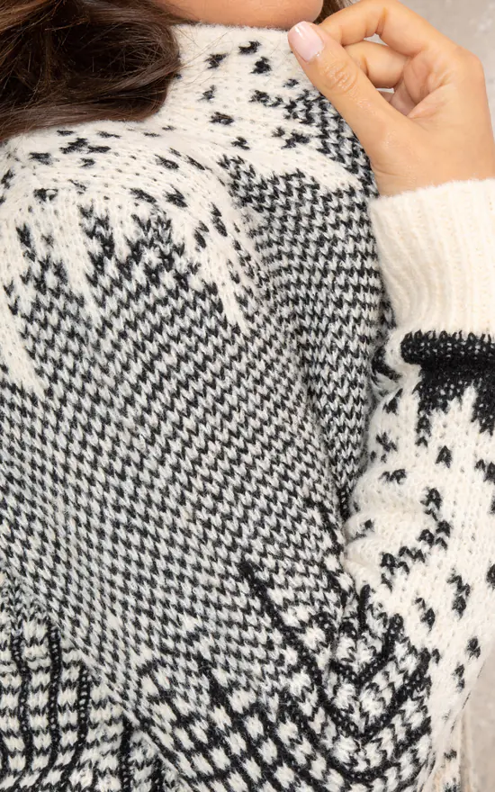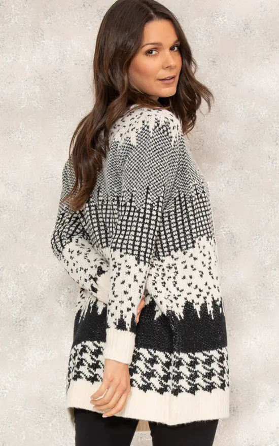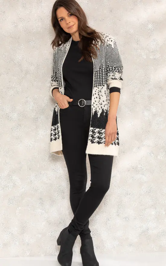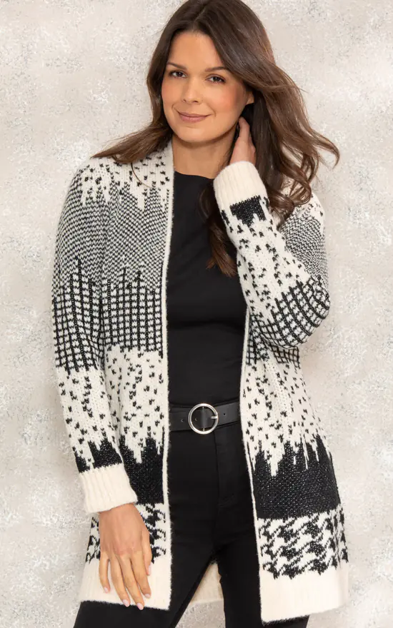 Bring some pattern to your knitwear collection and liven up your look with our patterned monochrome open front cardigan. Crafted in a soft knit with long sleeves, our cardigan looks perfect teamed with black trousers and a black top and ensures the cardigan takes centre stage. Back length 81cms.