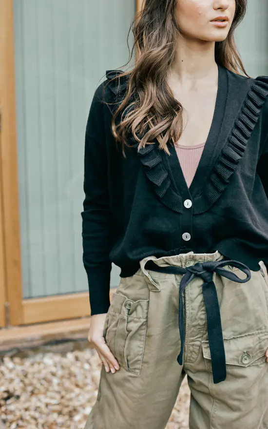 Add a feminine touch to your wardrobe with our crop boxy Victoria Cardigan in New Jet Black.
