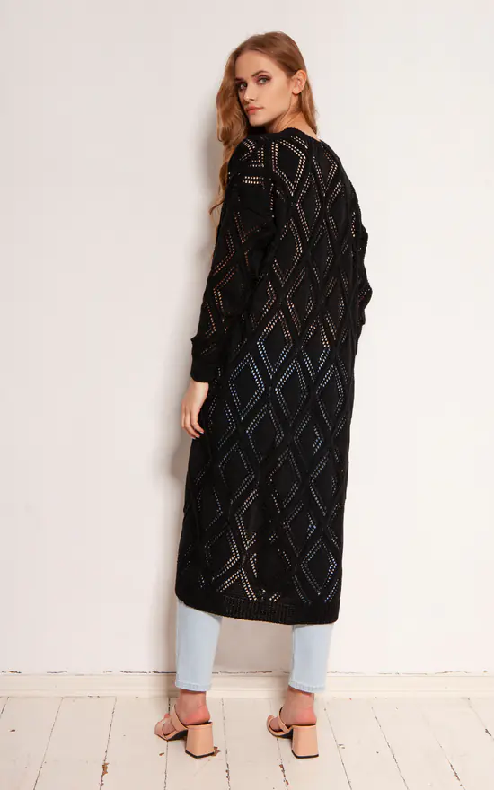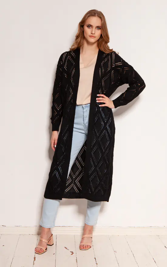 Lightweight cotton button-up sweater with drop-sleeves. Despite the loose cut, it does not add weight – thanks to the deep V-neckline. Openwork patterns match romantic dresses, but this sweater is so versatile that you can wear it with jeans as well. For work, for a party, for everyday use.
