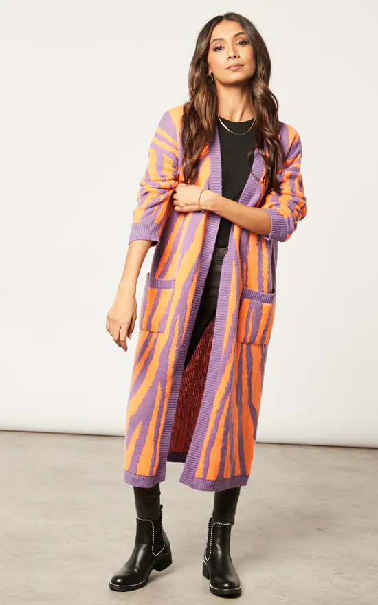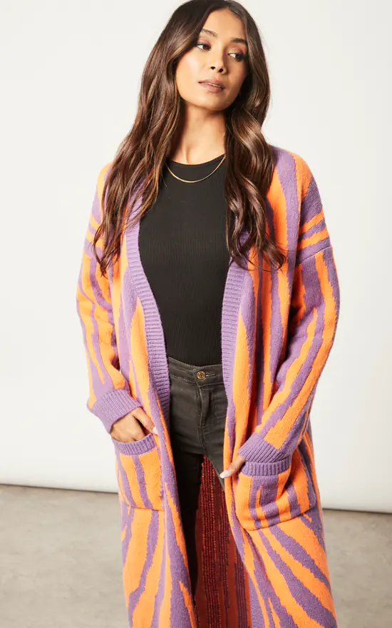 Budget ✔️ Liquorish Longline Cardigan In Orange And Lilac Zebra Pattern ????