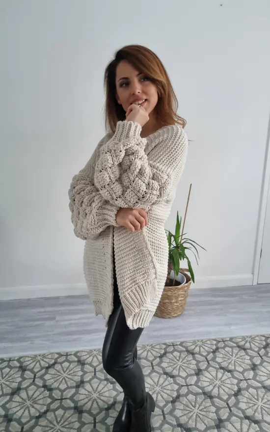 The Dieppe knitted cardigan with chunky square bobble sleeves has a relaxed fit perfect to keep you cosy in the cooler weather.
