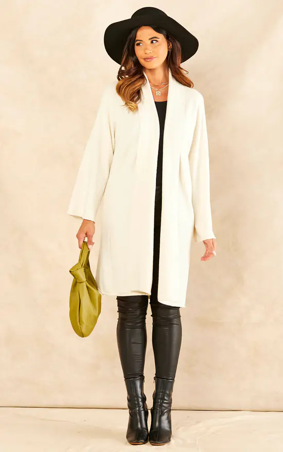 Lafayette midi length knitted longline cardigan is a warm, cute knit in a neutral cream colour that can be worn with jeans and a nice top or over a dress to keep you snug. The cardigan features a drape front and wide sleeve. This cardigan makes the perfect soft coat for those slightly warmer days.