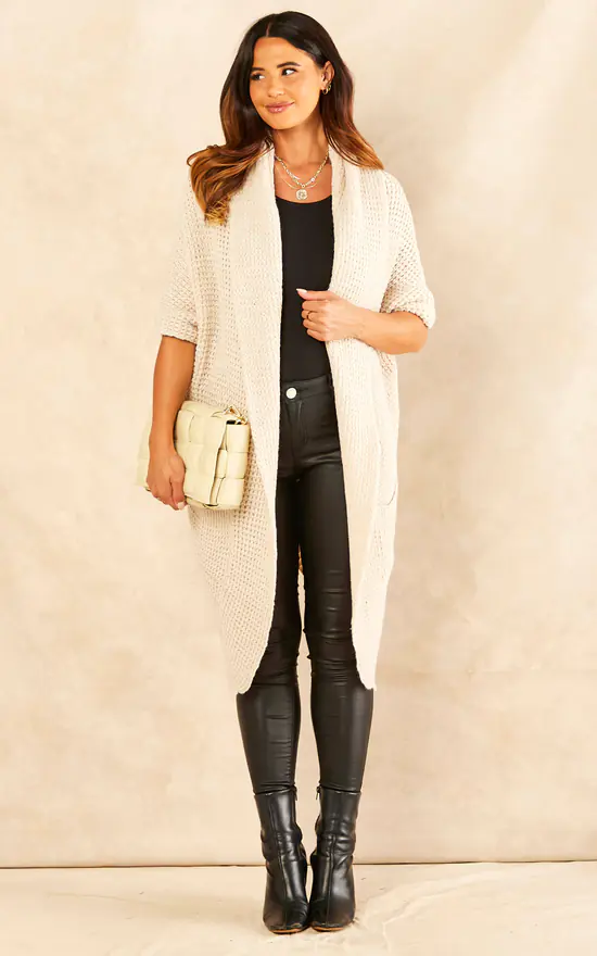 Product Code: QUEBEC LONGLINE ROLL FRONT SLOUCH KNIT CARDIGAN IN CREAM