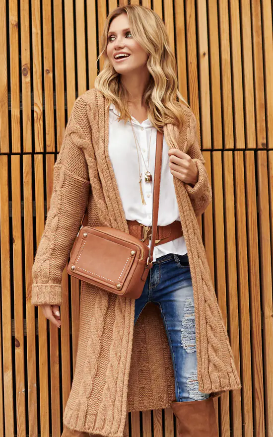 A long cardigan sweater will successfully replace light outdoor clothing. A simple cut without a closure with a coat-like cut. Decorated with elongated, effective braids, which makes it not boring. Be relaxed and in style!