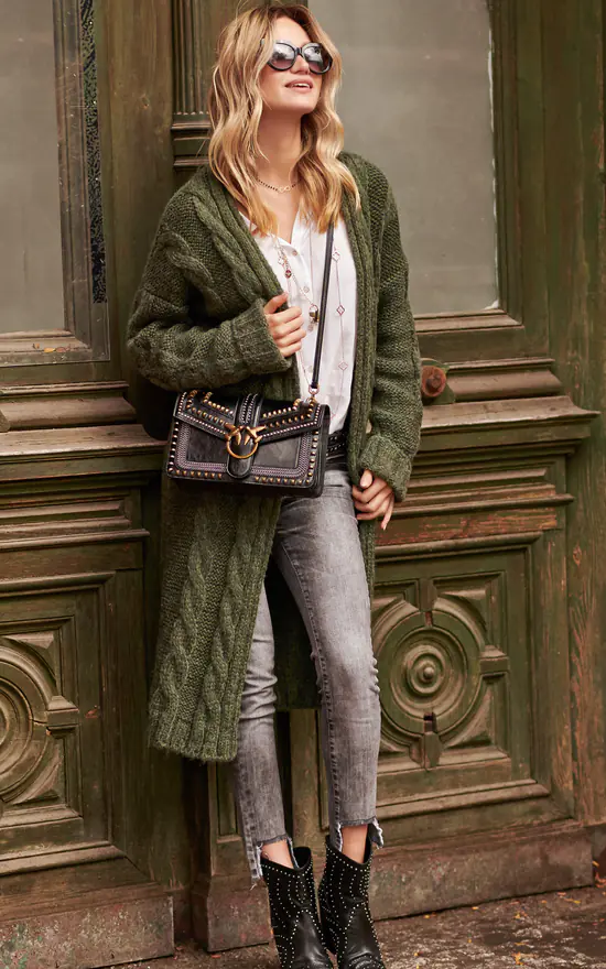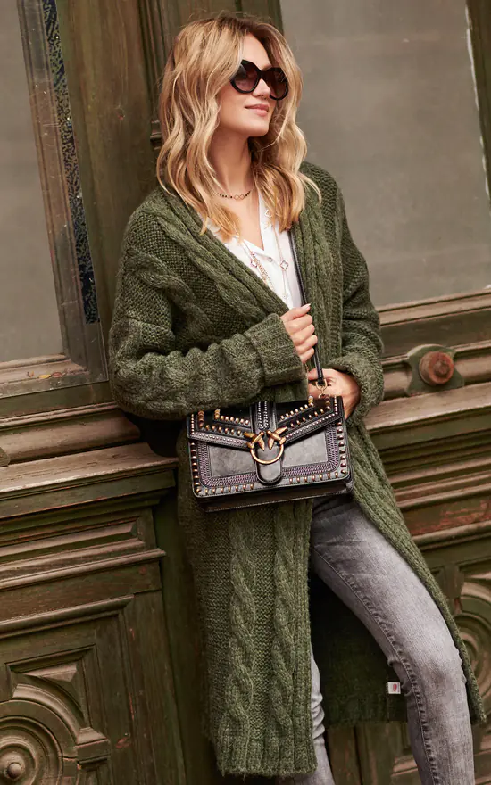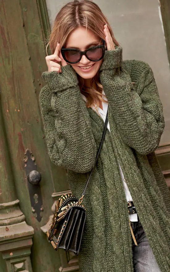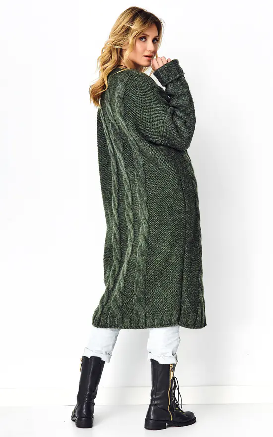 A long cardigan sweater will successfully replace light outdoor clothing. A simple cut without a closure with a coat-like cut. Decorated with elongated, effective braids, which makes it not boring. Be relaxed and in style!