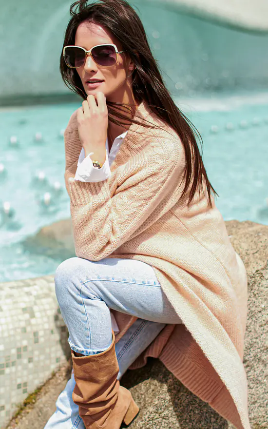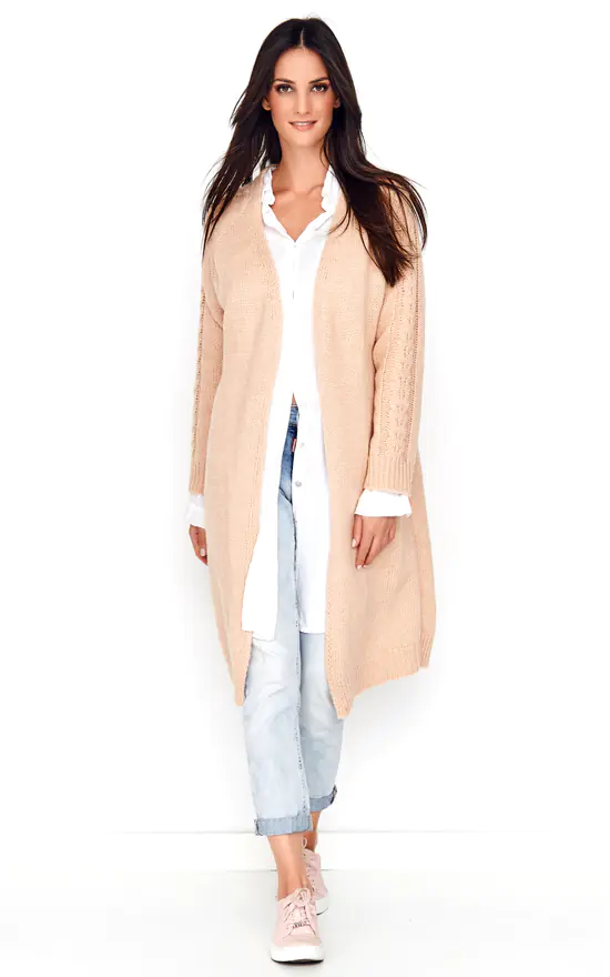 An unbuttoned, simple in its form cardigan sweater will certainly suit everyone. In a universal size with knee length. The whole is made with a classic weave, while the bottom and cuffs finished with a welt. It has a long sleeve, decorated with a sublime braid, which gives it not only character, but also girlish charm. This sweater is a great alternative to light jackets or sweatshirts. It is a functional and timeless wardrobe. After combining it with the right footwear, we create a stylization for many occasions. This sweater is a must-have of the last seasons!