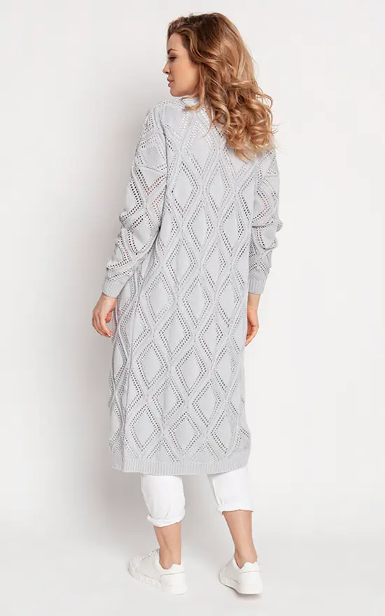 A mid-calf sweater coat is a fashionable option for the spring and summer season. You can easily create many styles on its basis. Its geometric, openwork weaves allow the colors to see through, creating unique compositions. Made in a family knitting factory from the highest quality yarn, which gives it a luxurious character.