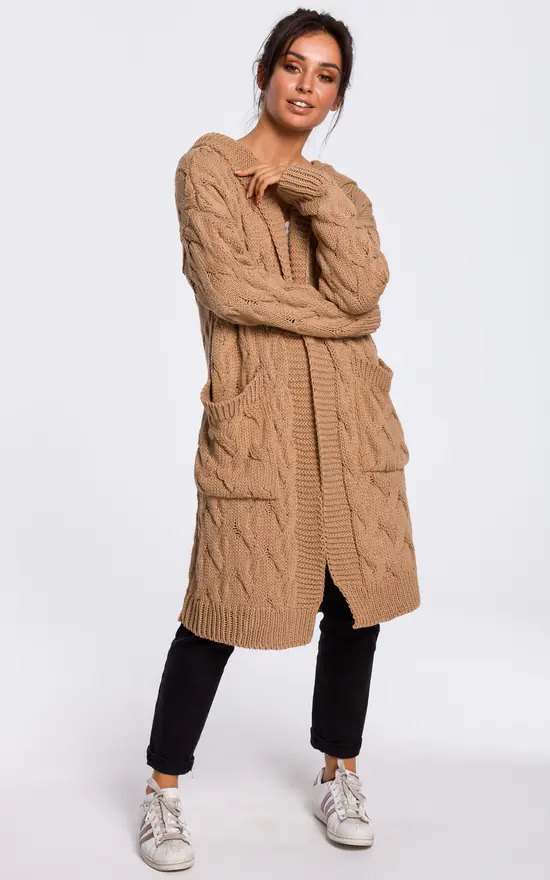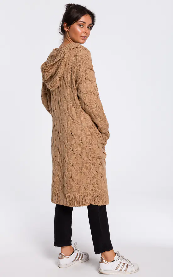 With an ample hood and front patch pockets this longline, pleated knit cardigan will always make you feel cosy and warm no matter the weather.