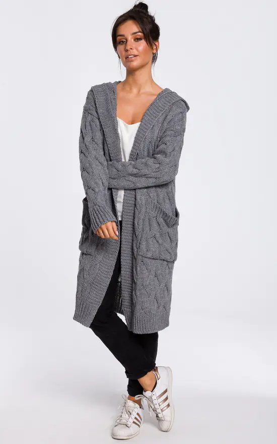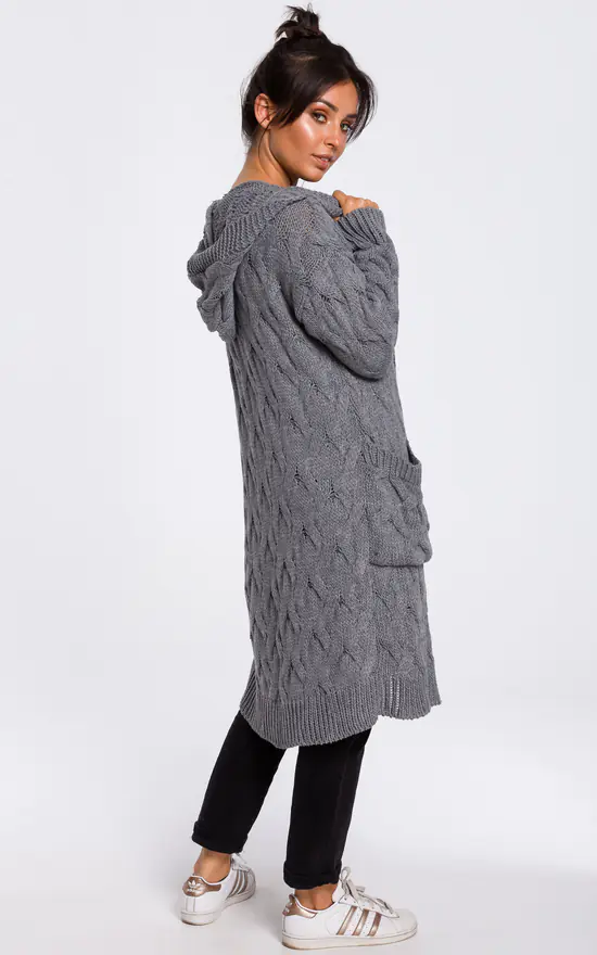 With an ample hood and front patch pockets this longline, pleated knit cardigan will always make you feel cosy and warm no matter the weather.