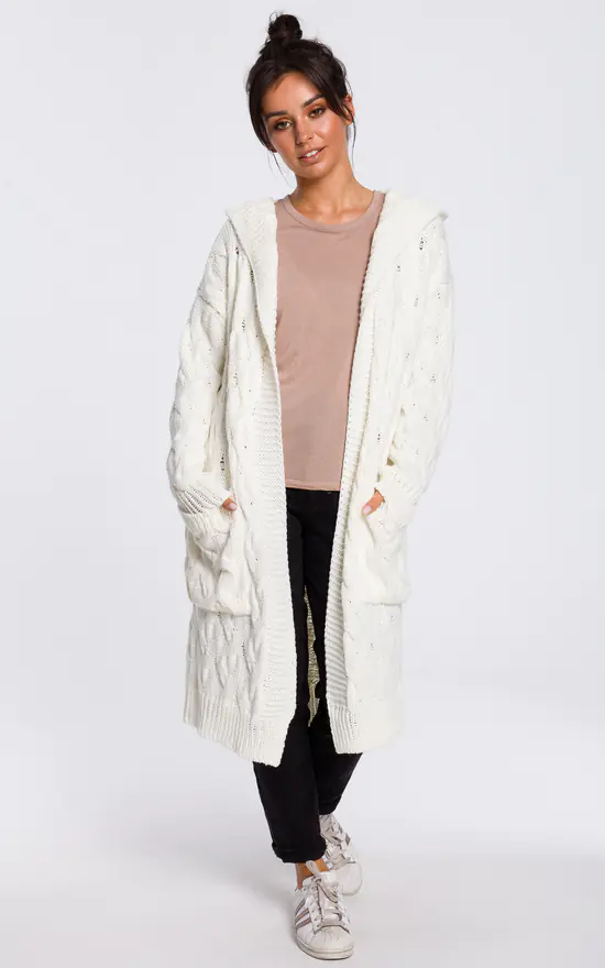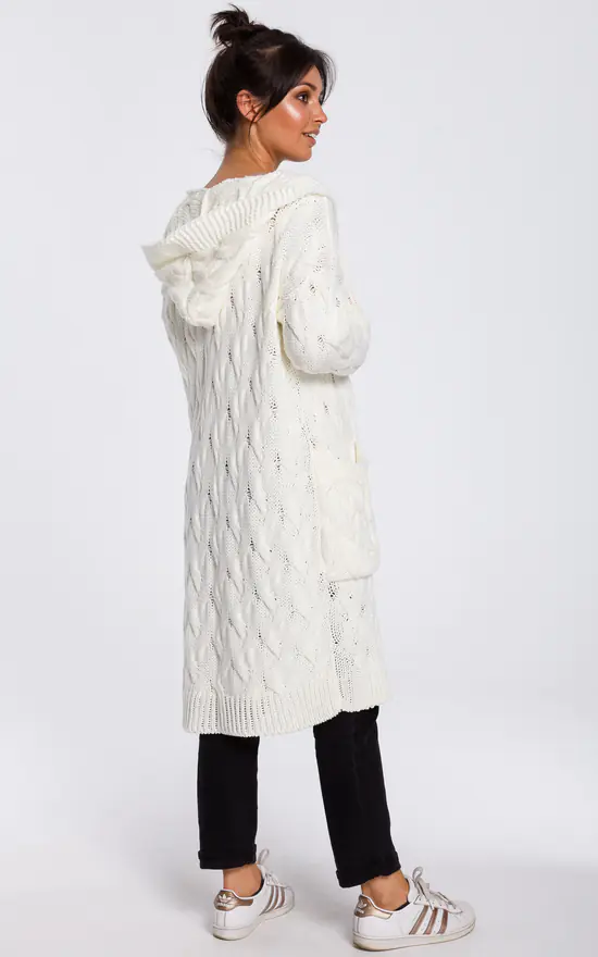 With an ample hood and front patch pockets this longline, pleated knit cardigan will always make you feel cosy and warm no matter the weather.